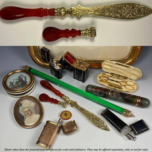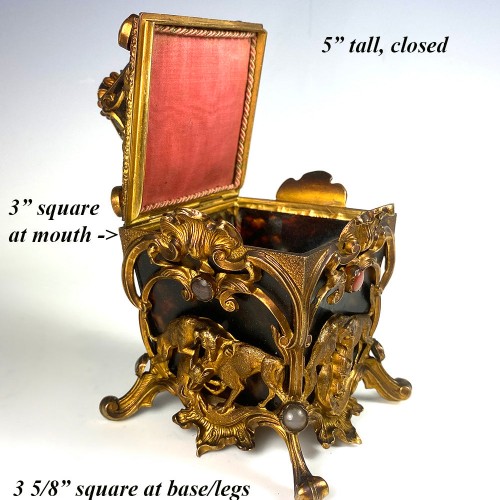 RARE Antique French Ormolu Frame 5″ Tall Jewelry Box, Scent Caddy, Dogs & Agate Jeweled