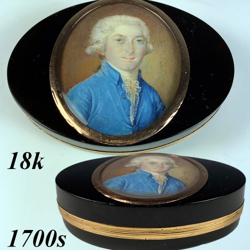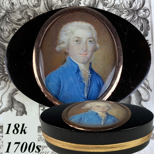 Rare 18th Century Portrait Miniature in Tortoise Shell Snuff or Patch Box, Heavy 18k Gold Fittings
