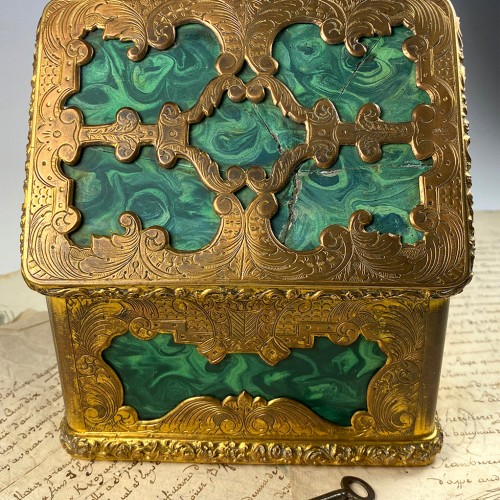 Rare Antique 19th c. French 5 3/8″ Jewelry Box, Russian Malachite Panels, Working Lock, Key