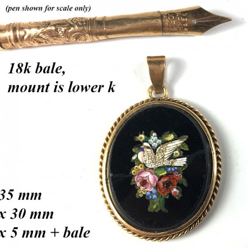 Antique 19th Century Italian Micro Mosaic 18k Mounted Flower and Dove Pendant, Grand Tour Souvenir