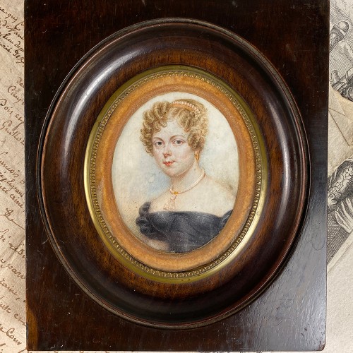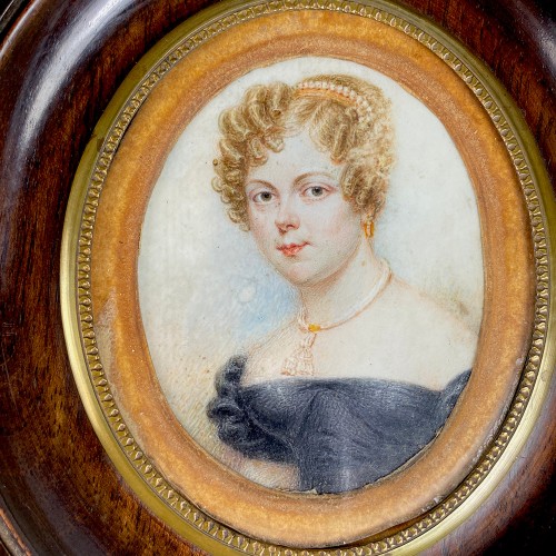 Antique early 19th Century French Portrait Miniature, Blond Woman with Tiara, Necklace, Frame