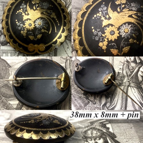 Antique Early Victorian Mourning Brooch, Tortoise Shell 18k Gold and Silver Pique Marquetry