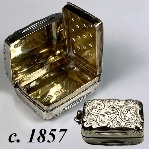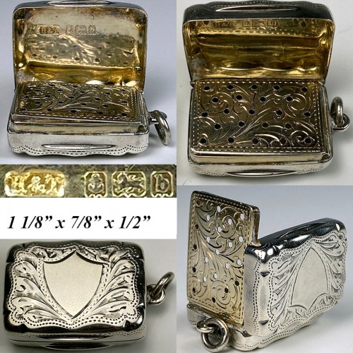 Antique English Victorian Sterling Silver Vinaigrette, Perfume or Scent Salts Box, Hallamrk c. 1857