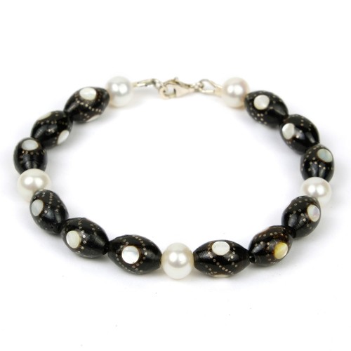 Black Coral and Hand Inlaid Silver and Mother of Pearl Bracelet with Sterling Silver Trigger Clasp