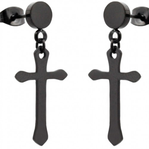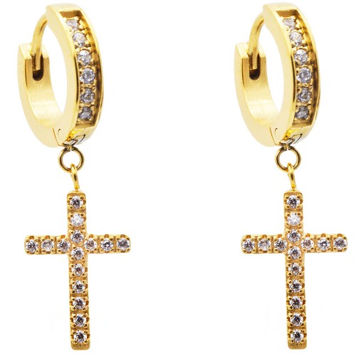 Mens Gold Plated Stainless Steel Hoop Cross Earrings With Cubic Zirconia