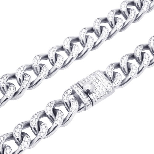 Mens Stainless Steel Curb Link Chain Set With Cubic Zirconia