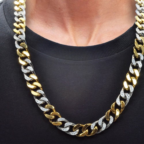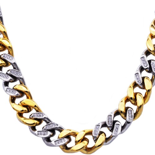 Mens 14mm Two Tone Gold Stainless Steel Cubic Zirconia Curb Link Chain Necklace