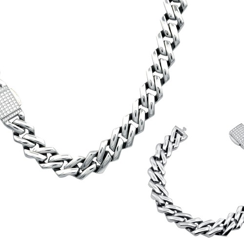 Mens 14mm Stainless Steel Monaco Link Chain Set With Cubic Zirconia Embedded Box Clasp
