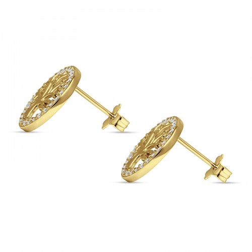 Tree Of Life Stud Earrings Cubic Zirconia Yellow Tone 925 Sterling Silver Wholesale 12.5mm