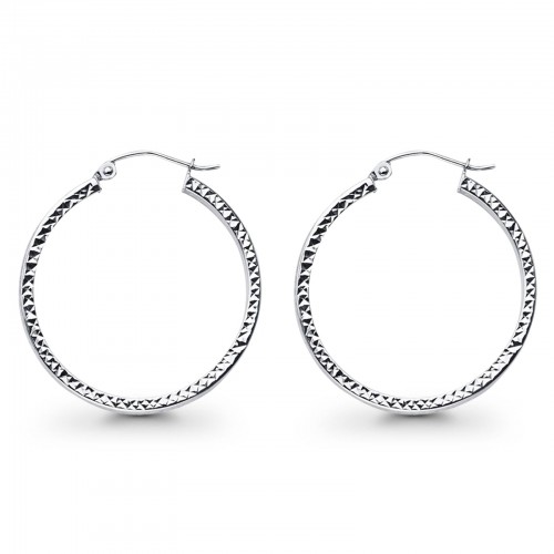 White 14K Gold Full Diamond Cut Square Tube Hollow Hoop Snap Closure Earrings 2.2grams 28mm