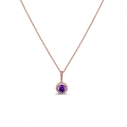 10K Rose Gold Amethyst & Diamond .58cts Round Pendant Necklace 18″ Long