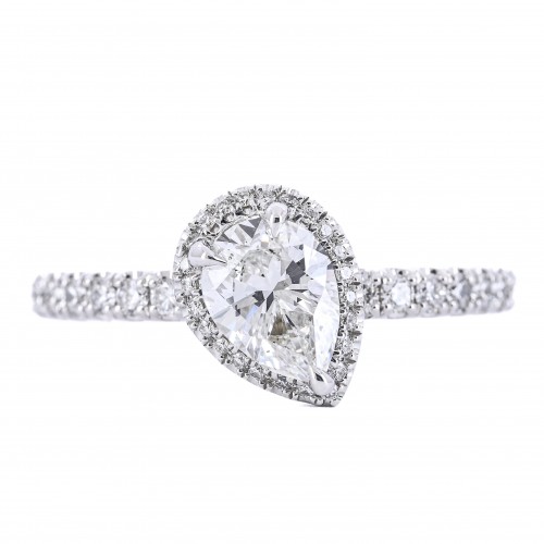 1.12CTW Slanted Pear Diamond Engagement Ring – Halo + Pavé Band – 14K White Gold