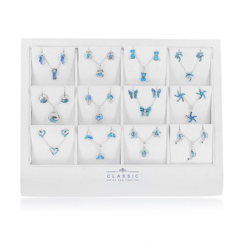 Collection of 12 Nautical & Basic Blue Opal Earring & Pendent Sets on a White Leatherette Display