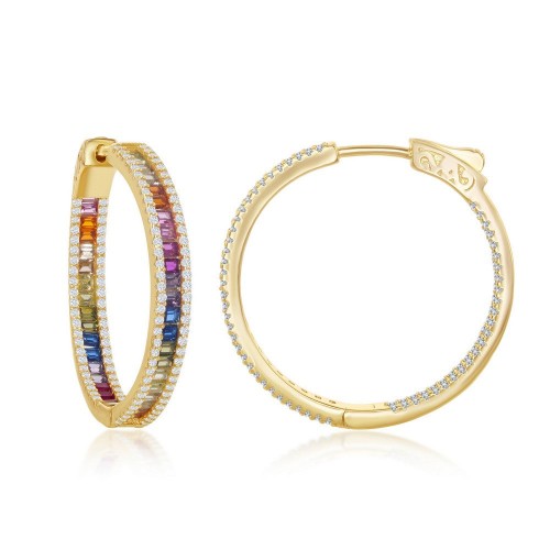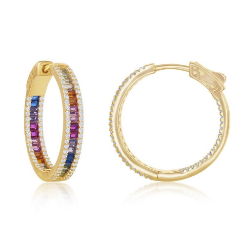 Sterling Silver 4x25mm Center Rainbow Channel-Set and White CZ Border Hoop Earrings – Gold Plated