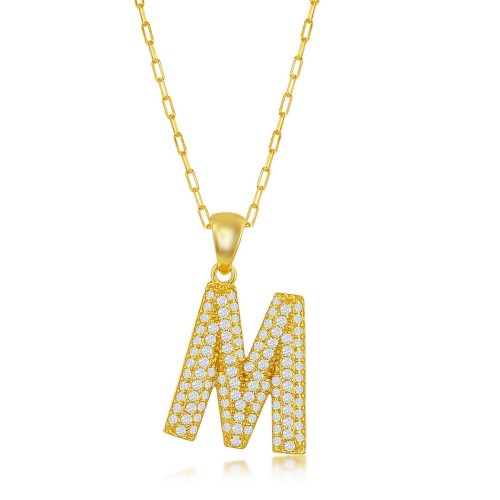 Sterilng Silver Micro Pave CZ M Block Initial w/ Paperclip Chain – Gold Plated