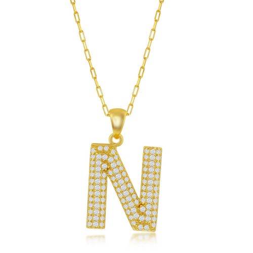 Sterilng Silver Micro Pave CZ N Block Initial w/ Paperclip Chain – Gold Plated