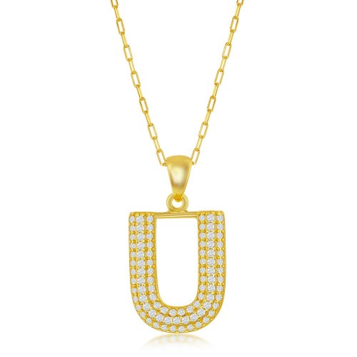 Sterilng Silver Micro Pave CZ U Block Initial w/ Paperclip Chain – Gold Plated