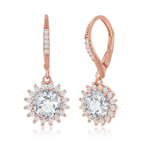 Sterling Silver Round Halo Flower CZ Dangling Earrings – Rose Gold Plated