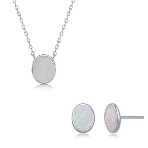 Sterling Silver White Inlay Opal Necklace and Earrings Set – Oval Disc