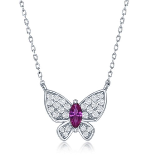 Sterling Silver White CZ with Center Ruby CZ Buterfly Necklace