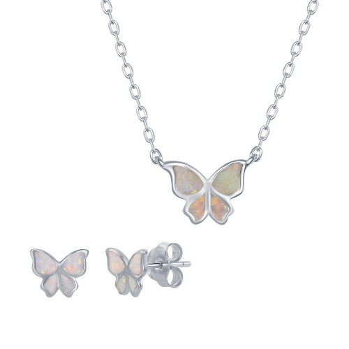 Sterling Silver White Inlay Opal Necklace and Earrings Set – Small Butterfly
