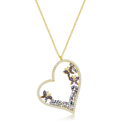 Sterling Silver White, Pink & Blue CZ Heart & Butterflies Necklace – Gold Plated