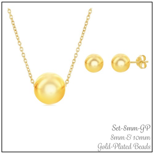 Sterling Silver 10mm & 8mm Bead Necklace and Earrings Set – Gold Plated