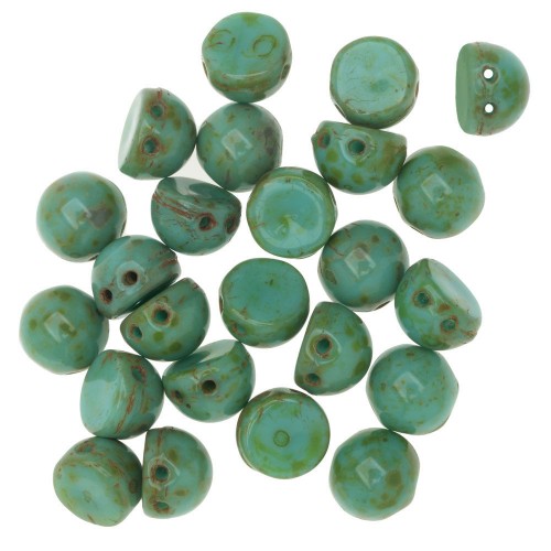 CzechMates Glass, 2-Hole Round Cabochon Beads 7mm Diameter, Opaque Turquoise Picasso (2.5″ Tube)