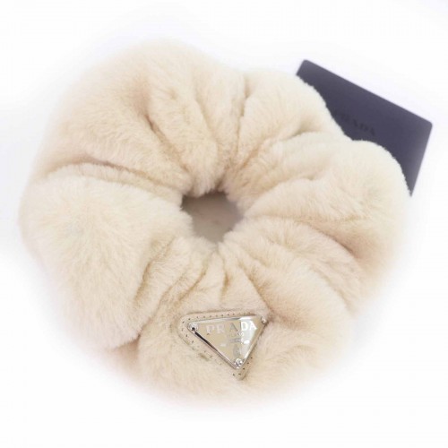 Prada Triangle With logo Sheep fur Hair Accessory Beige Others