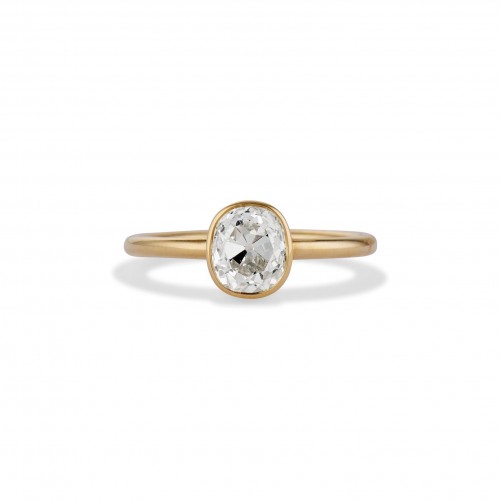 We adore the romantic Old European Cut diamond! A close relative to today’s scintillating Modern Round Brilliant, this stone offers the circular silhouette of a modern cut with the personality and charm of an antique diamond. This dainty 18 karat gold bezel setting lets the 1.02 carat diamond do the all talking! An open basket lets light flood the diamond for sparkle from all angles that can’t be missed. This ring feels right at home with your modern pieces and antiques alike.