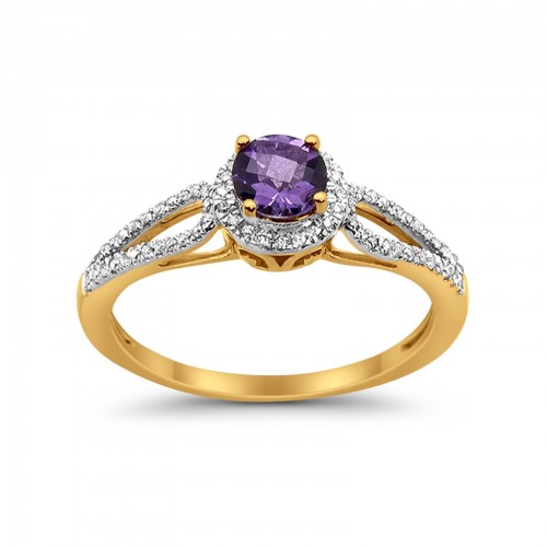 10K Yellow Gold Round Amethyst 0.54ct Diamond Ring Size 6.5