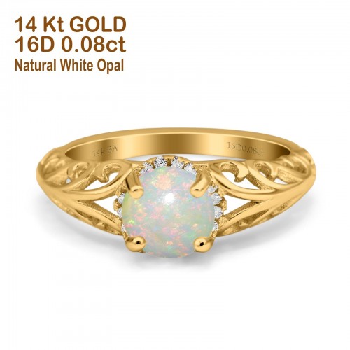 14K Rose Gold 0.08ct Round Art Deco Filigree 6.5mm G SI Natural White Opal Diamond Engagement Wedding Ring Size 6.5