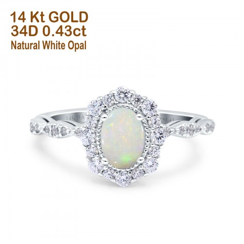 14K Rose Gold 0.43ct Vintage Art Deco Halo Oval 7mmx5mm G SI Natural White Opal Diamond Engagement Wedding Ring Size 6.5