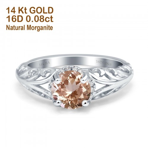 14K Rose Gold 1.11ct Round Art Deco Filigree 6.5mm G SI Natural Morganite Diamond Engagement Wedding Ring Size 6.5