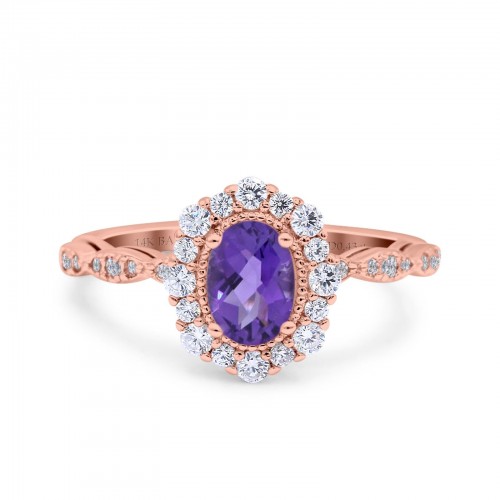 14K Rose Gold 1.19ct Vintage Art Deco Halo Oval 7mmx5mm G SI Natural Amethyst Diamond Engagement Wedding Ring Size 6.5