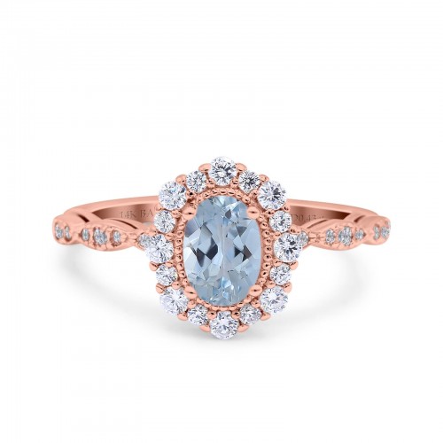 14K Rose Gold 1.19ct Vintage Art Deco Halo Oval 7mmx5mm G SI Natural Aquamarine Diamond Engagement Wedding Ring Size 6.5