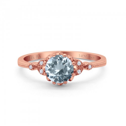 14K Rose Gold 1.34ct Round Art Deco Fashion 7mm G SI Natural Aquamarine Diamond Engagement Wedding Ring Size 6.5