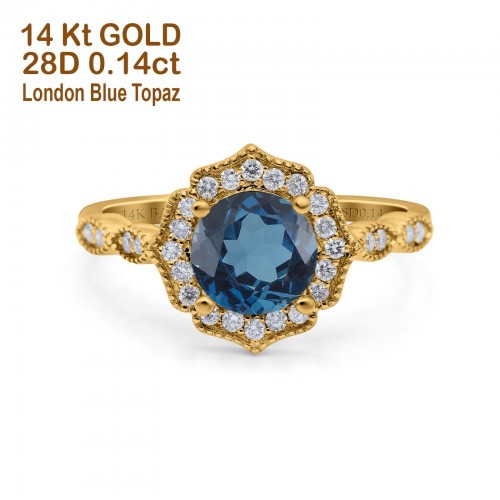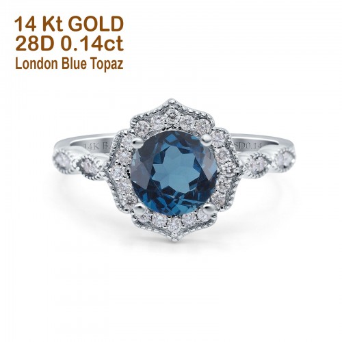 14K Rose Gold 1.42ct Art Deco Round 7mm G SI London Blue Topaz Diamond Engagement Wedding Ring Size 6.5