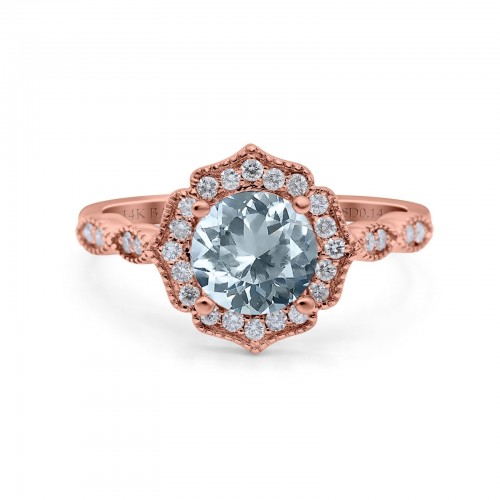 14K Rose Gold 1.42ct Art Deco Round 7mm G SI Natural Aquamarine Diamond Engagement Wedding Ring Size 6.5