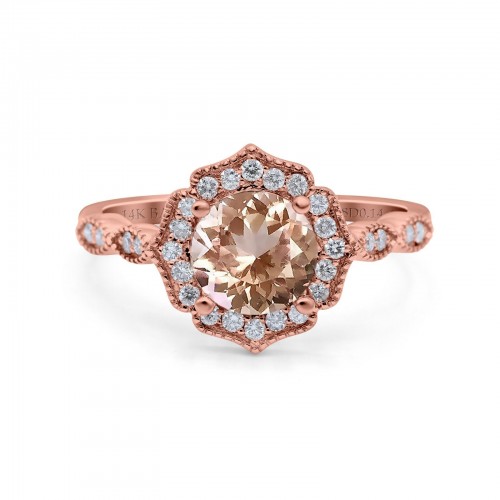 14K Rose Gold 1.42ct Art Deco Round 7mm G SI Natural Morganite Diamond Engagement Wedding Ring Size 6.5
