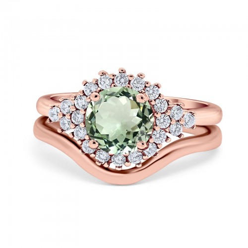 14K Rose Gold 1.59ct Round Two Piece Halo 7mm G SI Natural Green Amethyst Diamond Engagement Wedding Ring Size 6.5