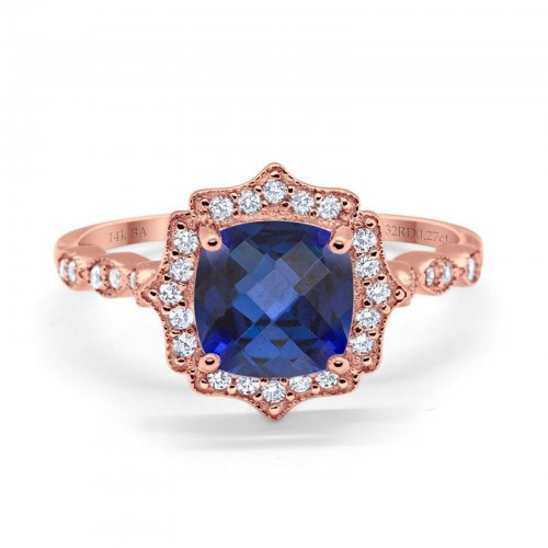 14K Rose Gold 2.31ct Cushion 8mm Halo G SI Nano Blue Sapphire Diamond Engagement Wedding Ring Size 6.5