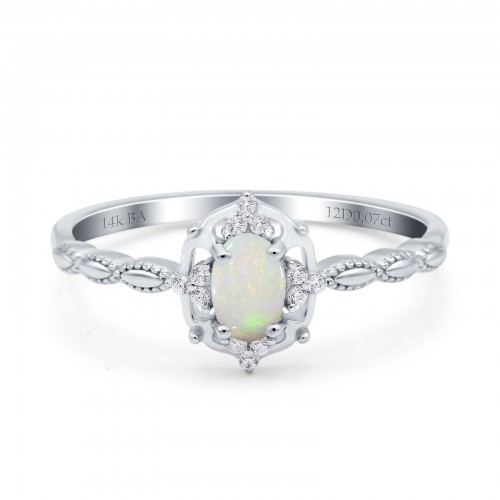 14K White Gold 0.07ct Oval Vintage Floral 6mmx4mm G SI Natural White Opal Diamond Engagement Wedding Ring Size 6.5