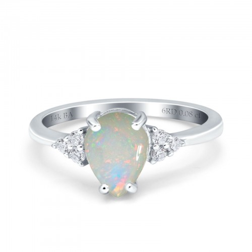 14K White Gold 0.08ct Teardrop Pear 8mmx6mm G SI Natural White Opal Diamond Engagement Wedding Ring Size 6.5