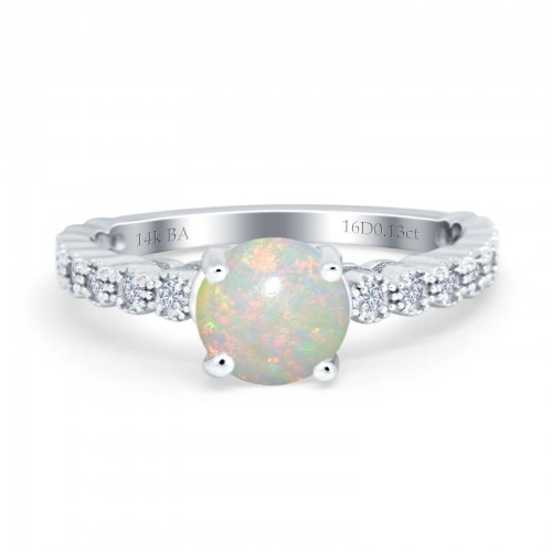 14K White Gold 0.13ct Round 6.5mm G SI Natural White Opal Diamond Engagement Wedding Ring Size 6.5