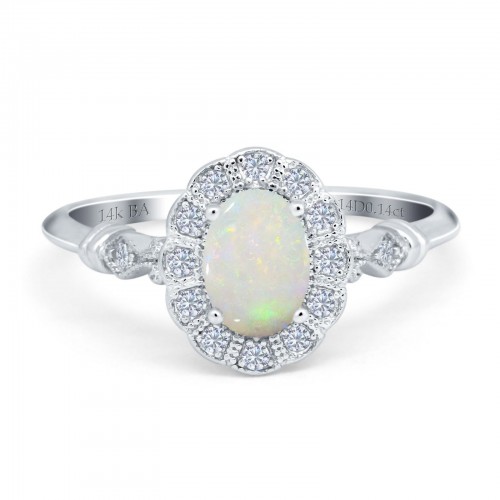 14K White Gold 0.14ct Oval 7mmx5mm G SI Natural White Opal Diamond Engagement Wedding Ring Size 6.5