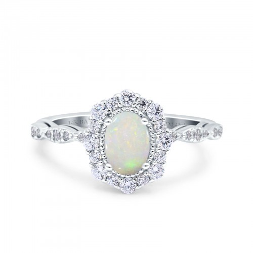 14K White Gold 0.43ct Vintage Art Deco Halo Oval 7mmx5mm G SI Natural White Opal Diamond Engagement Wedding Ring Size 6.5