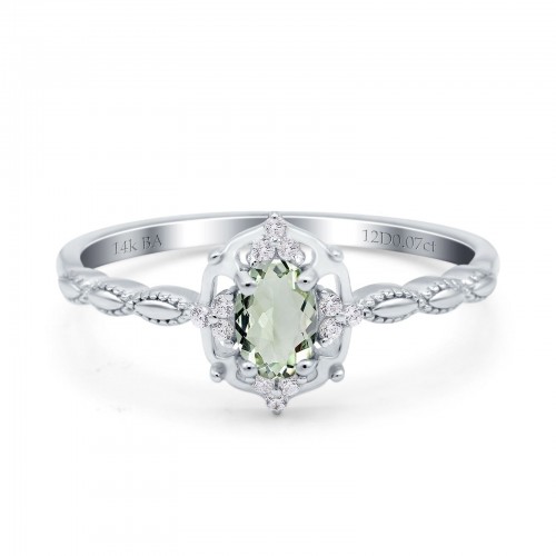 14K White Gold 0.5ct Oval Vintage Floral 6mmx4mm G SI Natural Green Amethyst Diamond Engagement Wedding Ring Size 6.5