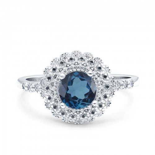 14K White Gold 0.77ct Halo Art Deco Round 5.5mm G SI London Blue Topaz Diamond Engagement Wedding Ring Size 6.5