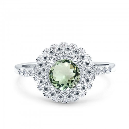 14K White Gold 0.77ct Halo Art Deco Round 5.5mm G SI Natural Green Amethyst Diamond Engagement Wedding Ring Size 6.5